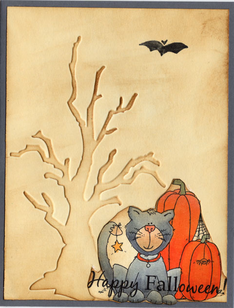 Today the temp is supposed to be close to 100, but then Tuesday it drops to 75. So, I am more than ready for fall. This week the image from Designed2Delight is really sweet. I had colored it and then cut it out to go on another card and that didn't work at all so not to be outdone I put it on this background made with my new Sizzix embossing folder. The card doesn't look nearly as crooked as the pic, so hopefully the recipient of this one won't have a ruler handy.